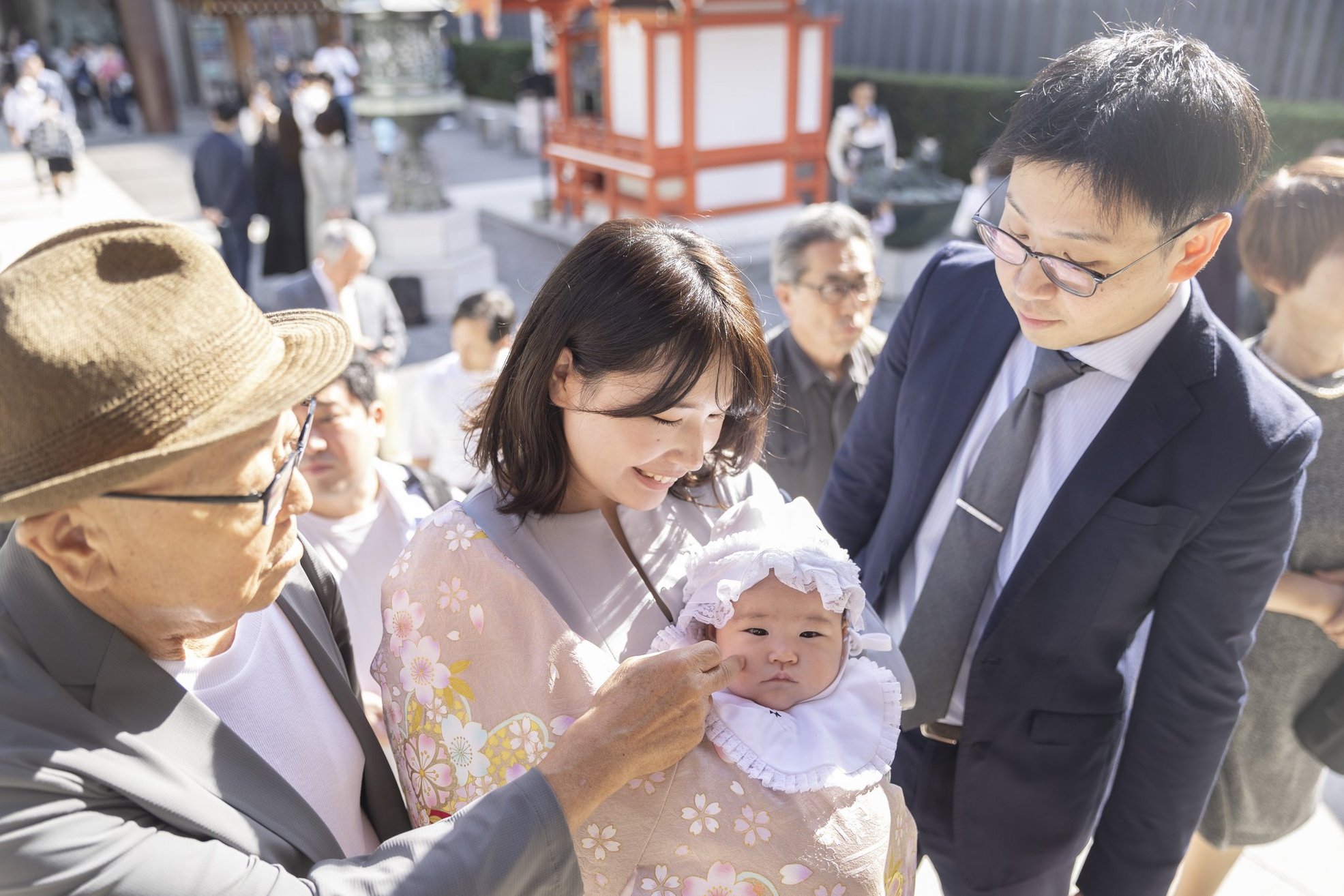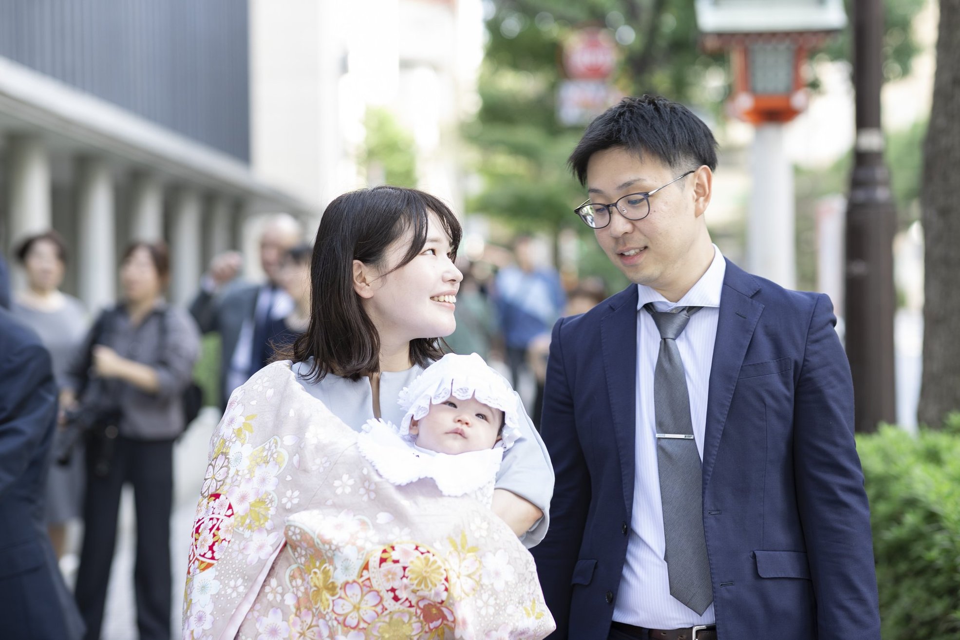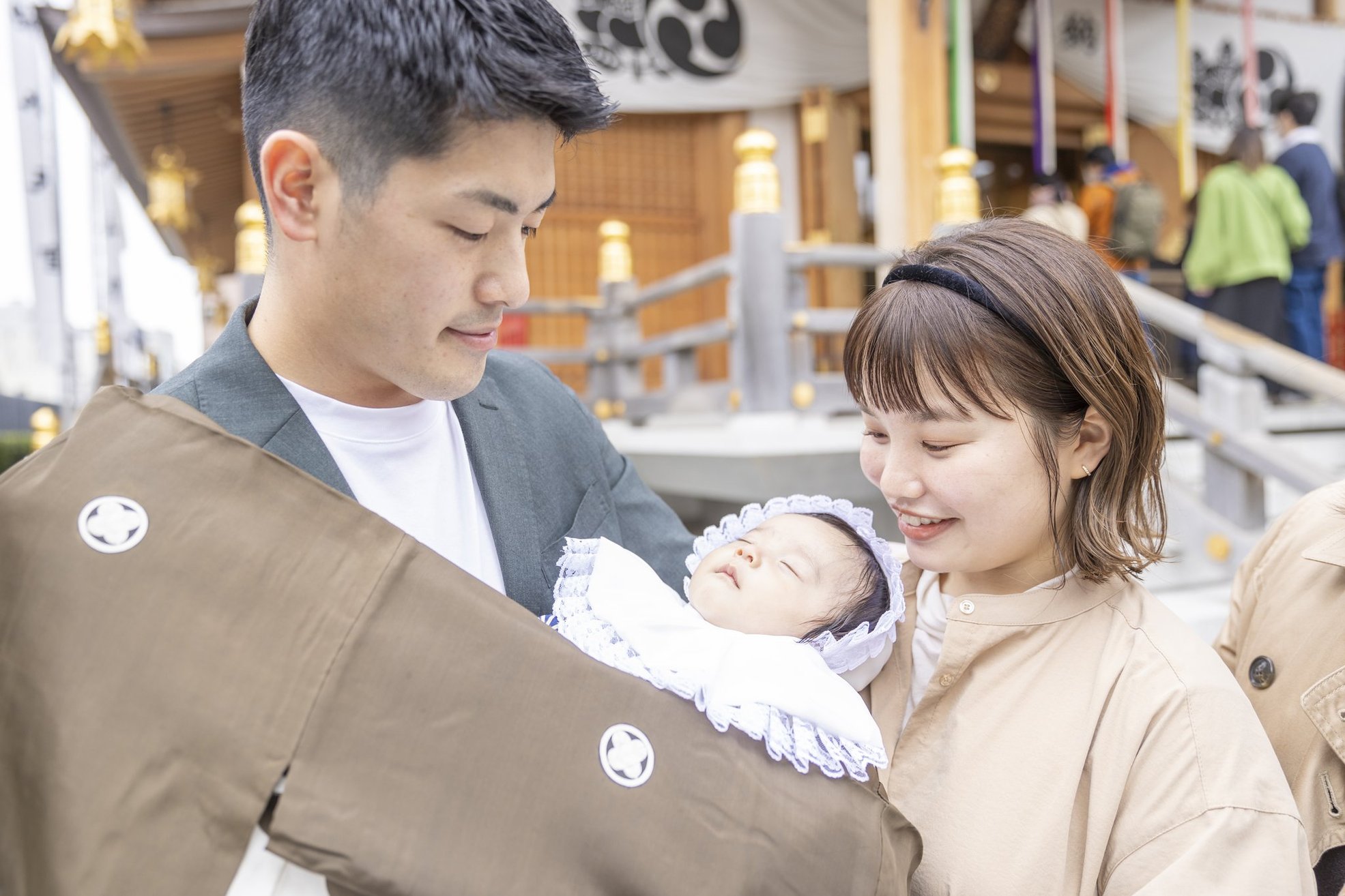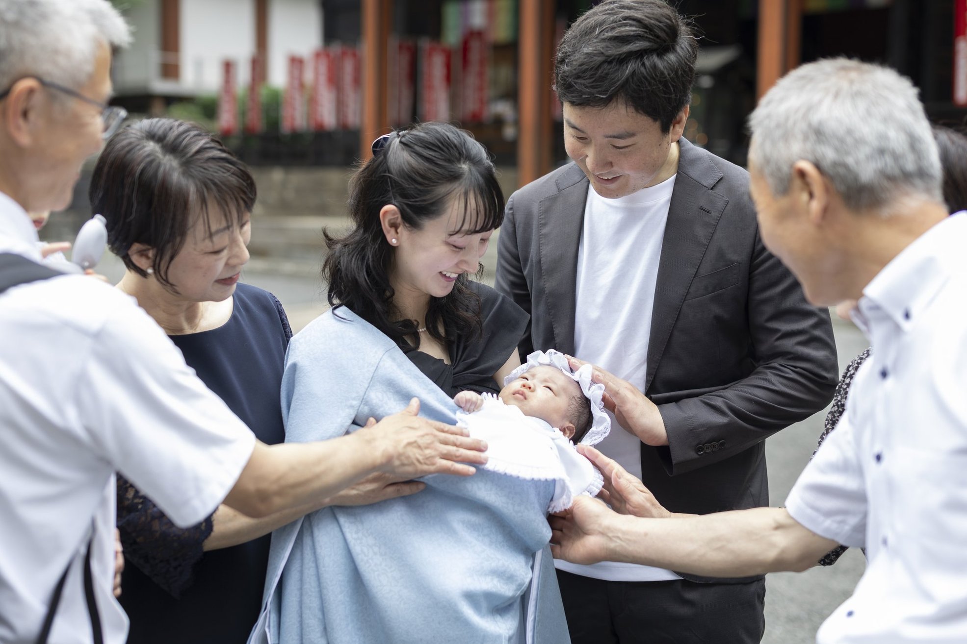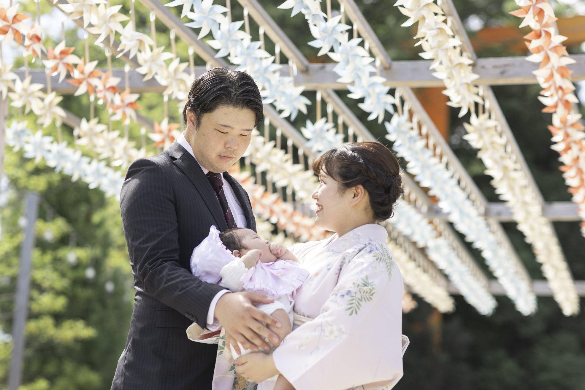 神社でのお参りのシーンはもちろん、赤ちゃんを優しく抱くご両親や、